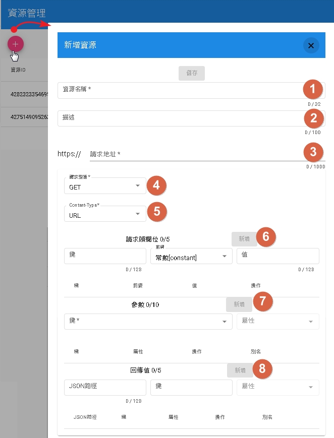 4.請求型態:指定資源的請求方法,目前支援GET、POST、PATCH、PUT、DELETE請求方式。