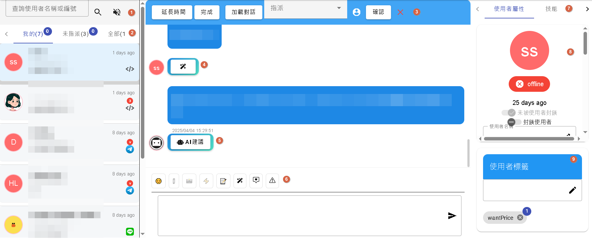 * 3\. 可以延長真人客服時間、完成、加載對話(一般往上會自動加載)、指派其他訪客、關閉會將整個對話關閉(關閉後才算完成客服活動)。
